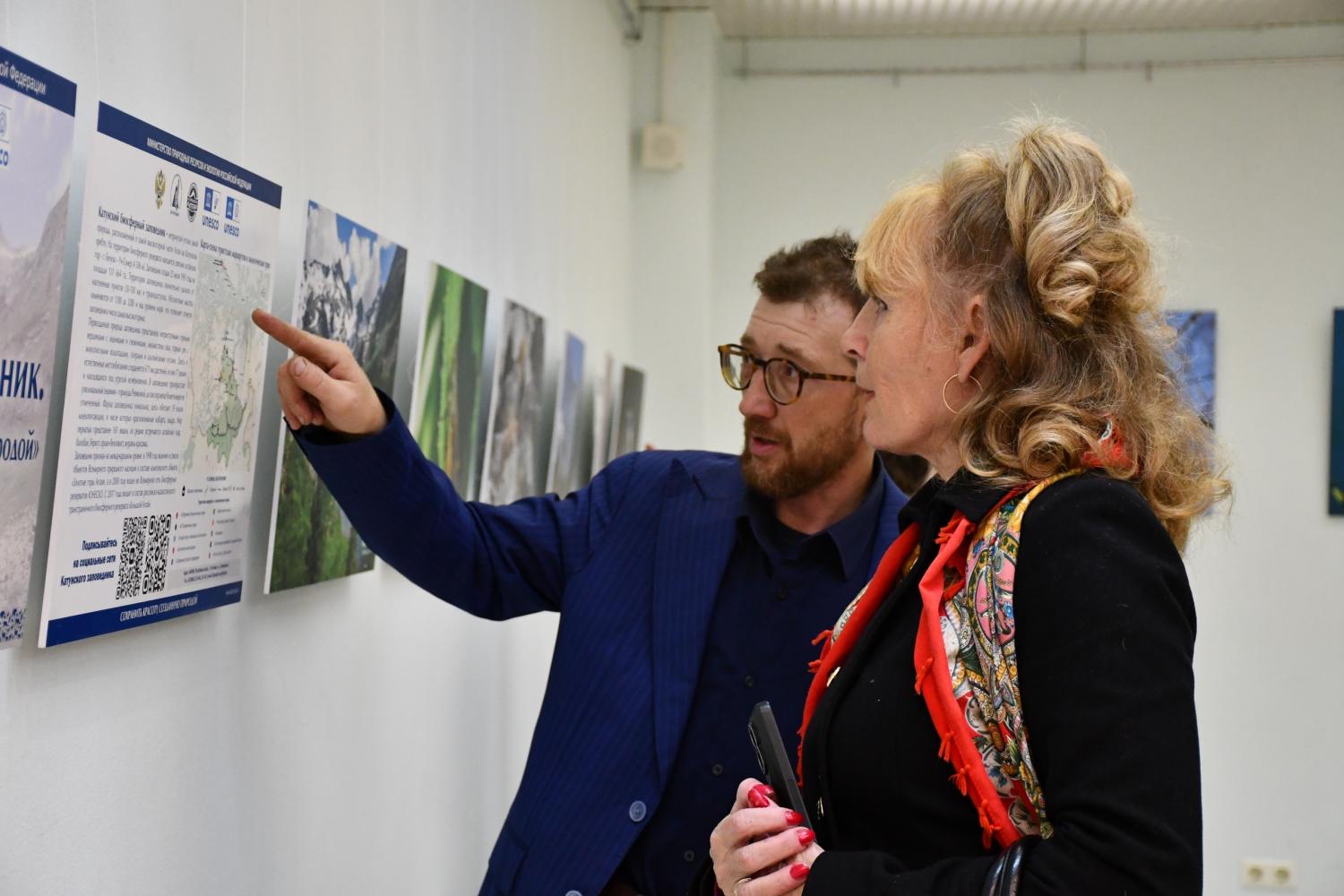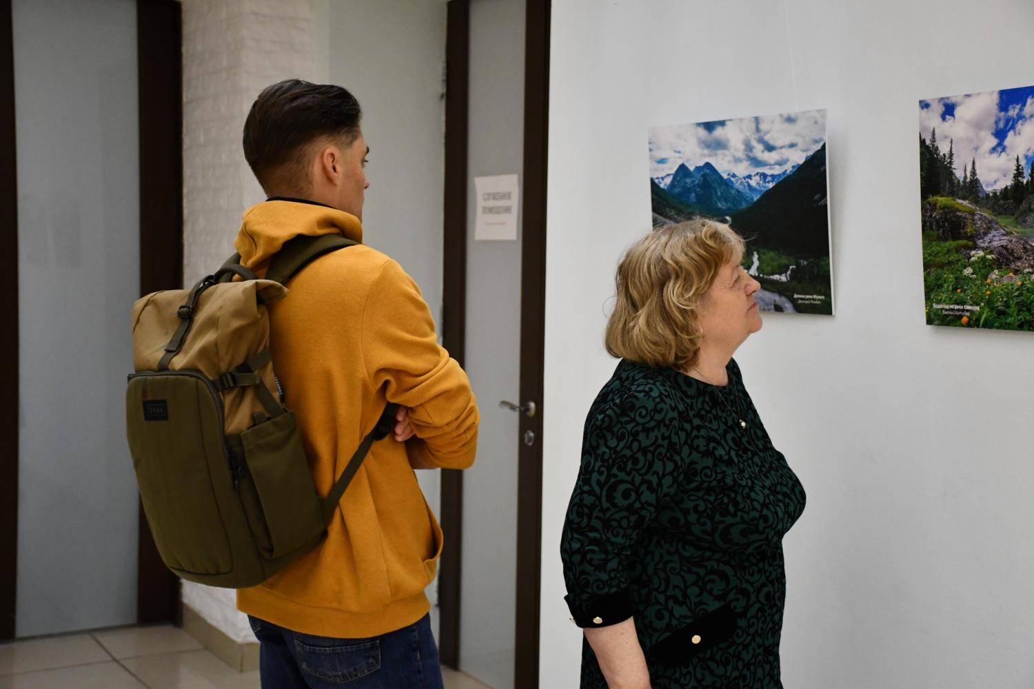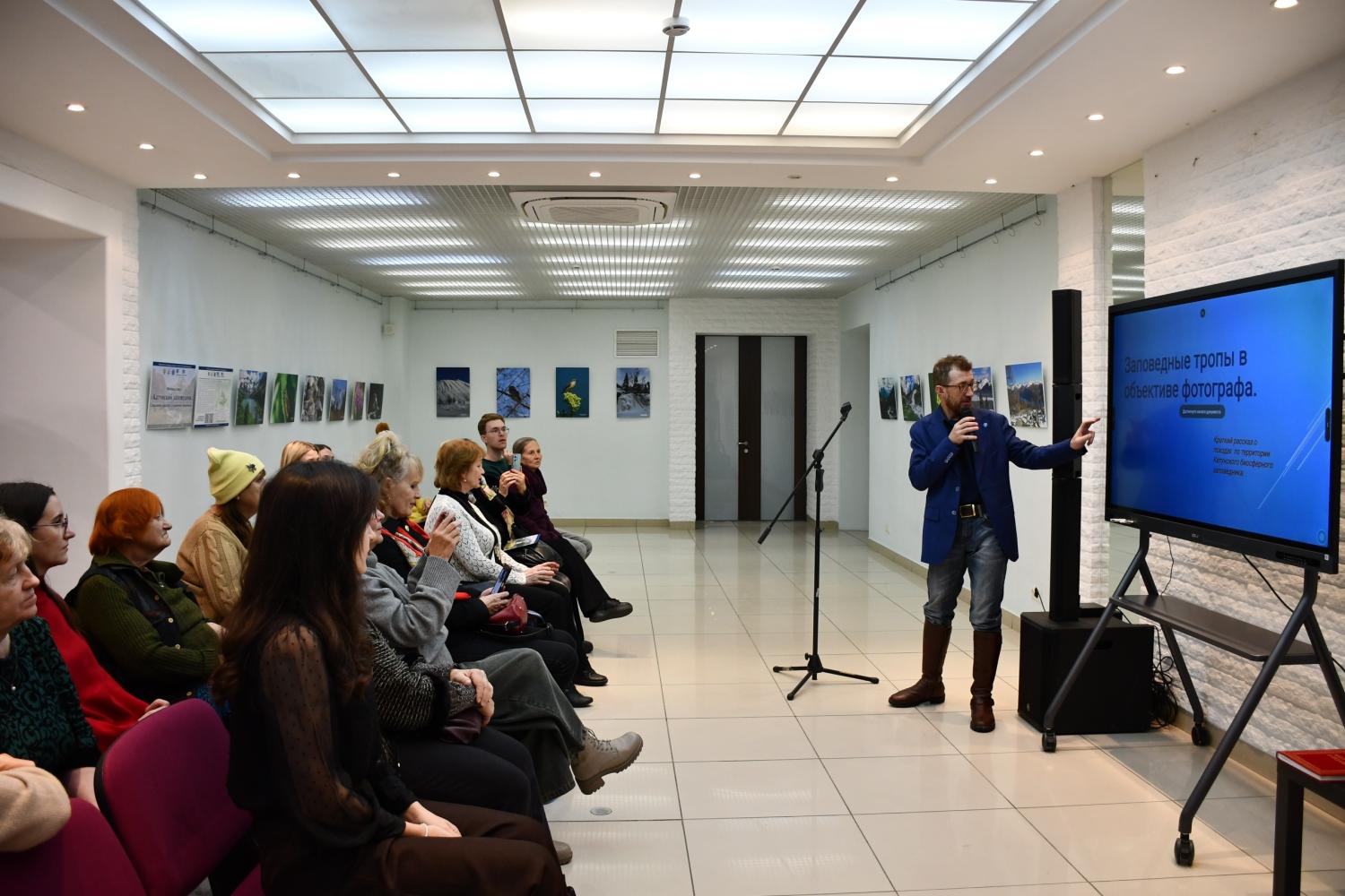 На открытии выставки гости встретились с известным фотографом и путешественником, членом Русского географического общества Александром Мокеровым, который рассказал о своём опыте съёмок в труднодоступных местах Алтая и экспедициях в Катунский заповедник.