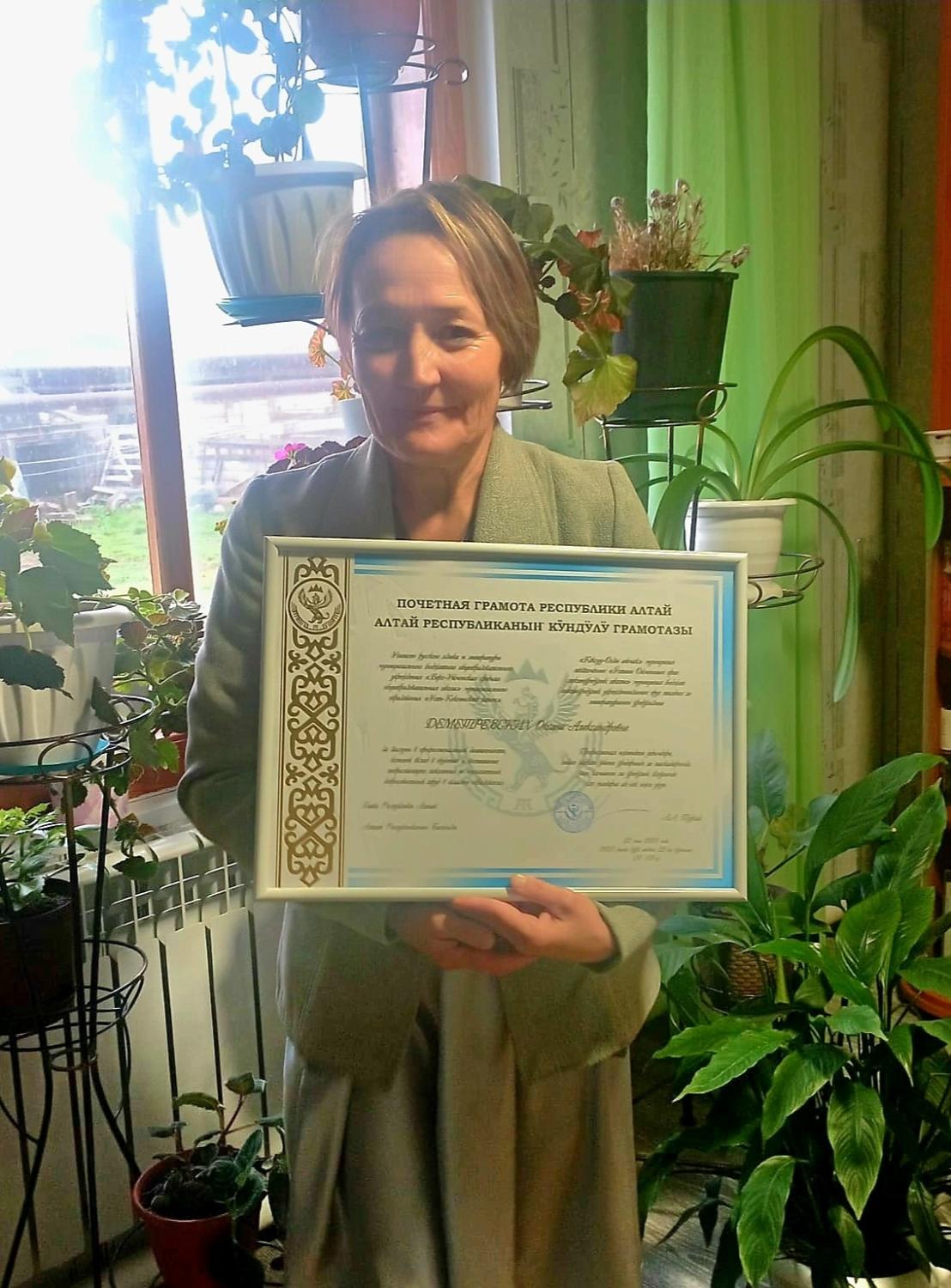 Оксану Александровну Деметревских – учителя русского языка и литературы Верх-Уймонской школы за заслуги в профессиональной деятельности, большой вклад в обучение и воспитание подрастающего поколения и многолетний добросовестный труд в области образования наградили Почетной грамотой Республики Алтай. Оксана Александровна возглавляет экологический клуб «Эколята» и активно занимается просвещением школьников в области экологии.