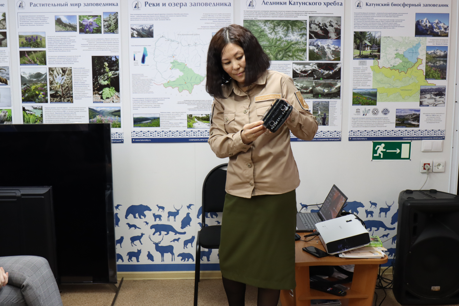 Во время мероприятия научный сотрудник Айсулу Тордокова познакомила юных экологов с основными направлениями научной деятельности заповедника. Подробно рассказала о методиках изучения популяции численности животных, как можно измерить высоту снежного покрова или определить сколько воды находится в твердых осадках, какие данные можно получить благодаря автономным метеостанциям. Также ребята посмотрели различные приборы, которые используются для мониторинга природных явлений, познакомились с научными трудами заповедных ученых. Особый интерес и восторг у гостей вызвали фотографии и видео обитателей заповедника, полученные при помощи фотоловушек.